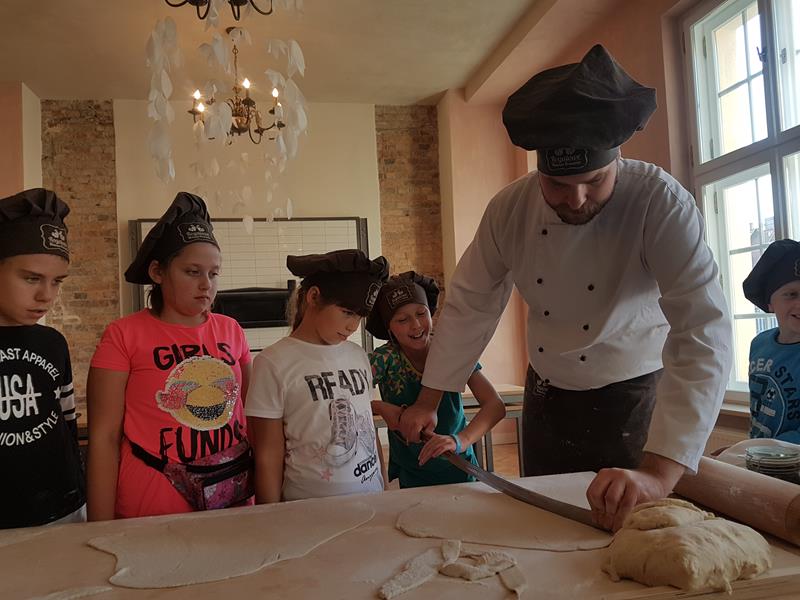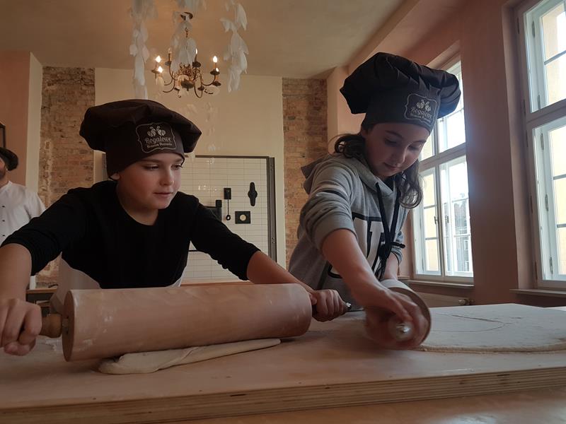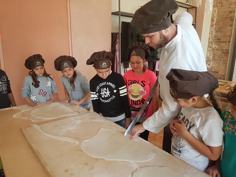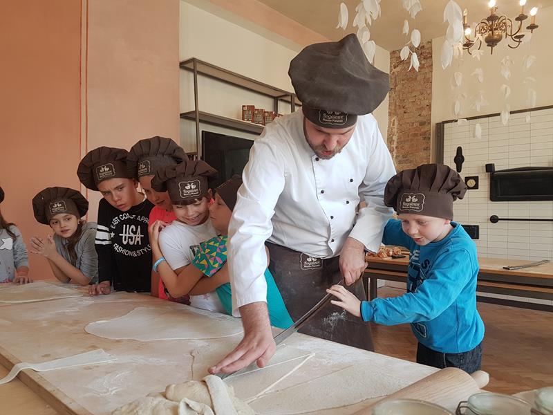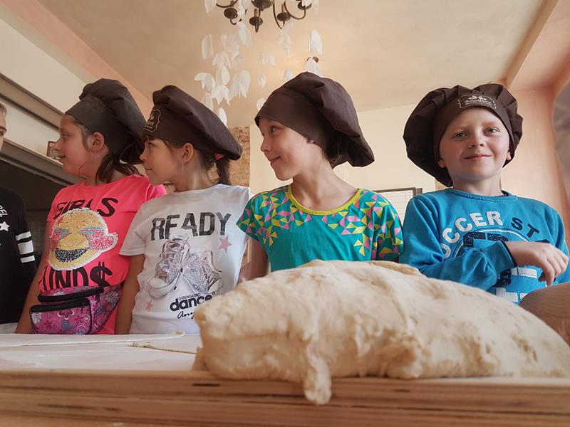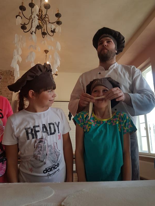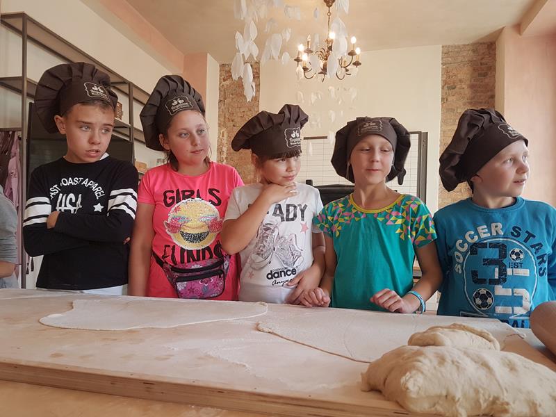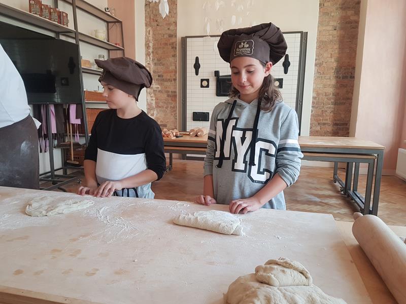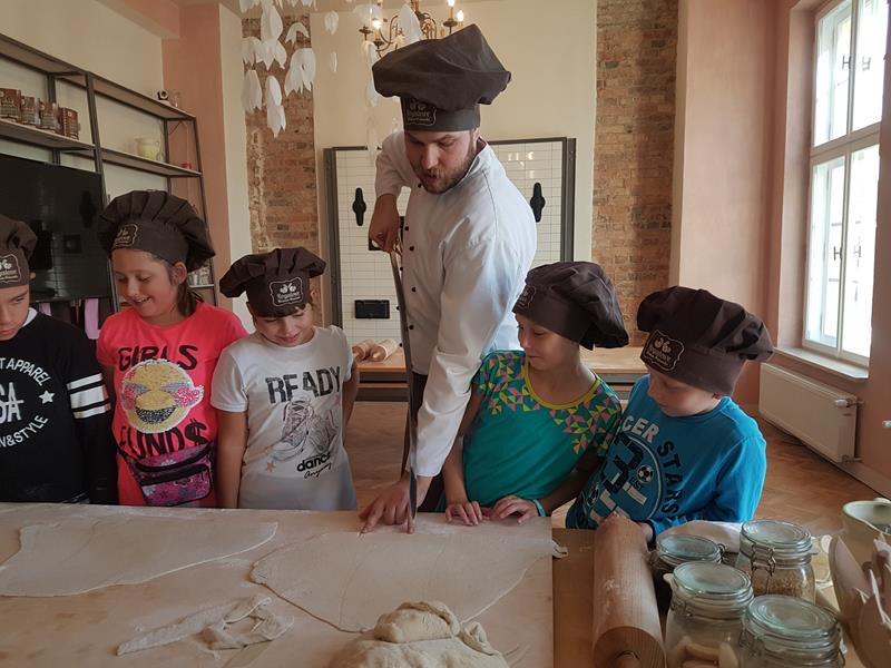 Na obiad były dwa naleśniki z mięsem, ketchupem i do tego sok. Obiad był bardzo dobry. Następnie poszliśmy robić rogale. Było tam fajnie. Mieliśmy czapki wysokie. Pan z wąsem ciął rogale szablą i mówił, że palce spadają do wiadra. Zobaczyliśmy, jak się robi poznańskie rogale. Pan powiedział, że mamy zgadnąć, ile waży prawdziwy marciński rogal. Dwie osoby zgadły, że 250 gramów i dostały prawdziwego rogala. Wszystkie dzieci też dostały rogale do zjedzenia, ale po połowie. Na koniec pan pokazał nam na filmie legendę o rogalach. Kiedy skończył się film, podziękowaliśmy panom za pokazanie wszystkiego. Poszliśmy do autokaru. Z Poznania wyjeżdżaliśmy o godz. 15, a w Gnieźnie byliśmy ok. 16. Na wycieczce było bardzo fajnie. Wszystko mi się podobało, a najbardziej labirynt ,,Blubry 6D”.