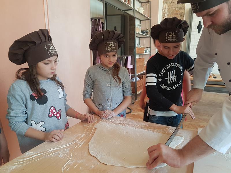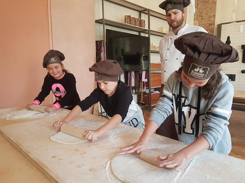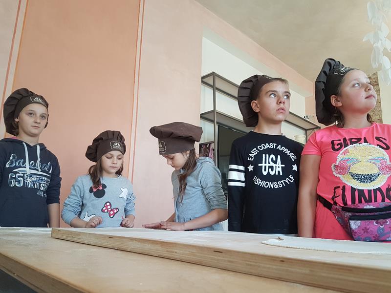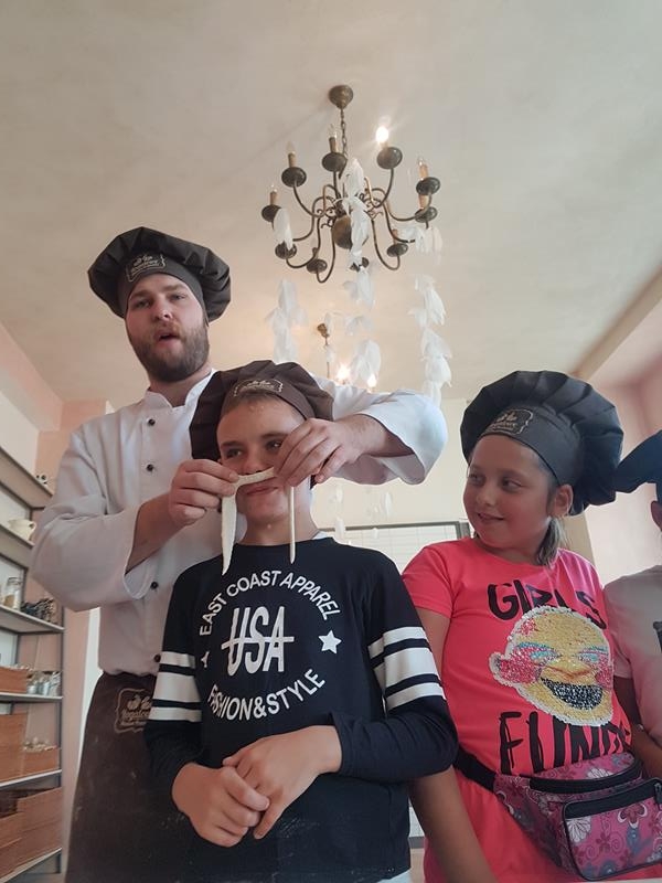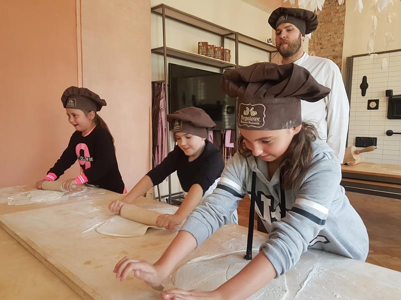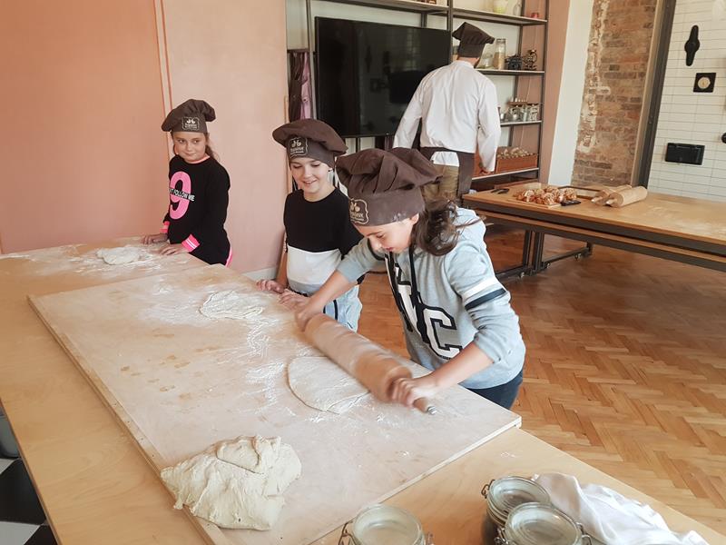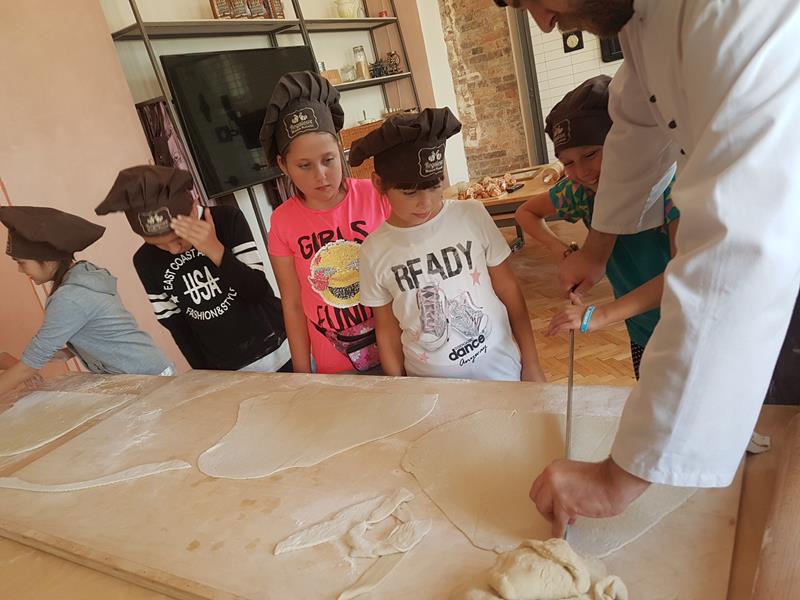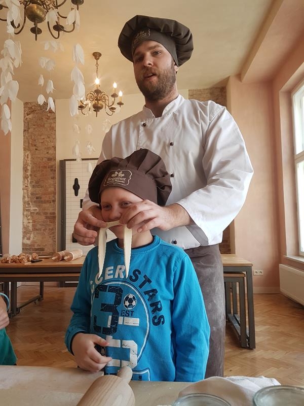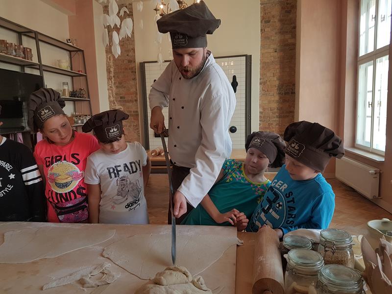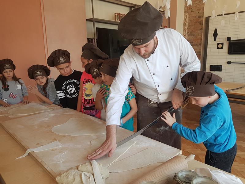 Na obiad były dwa naleśniki z mięsem, ketchupem i do tego sok. Obiad był bardzo dobry. Następnie poszliśmy robić rogale. Było tam fajnie. Mieliśmy czapki wysokie. Pan z wąsem ciął rogale szablą i mówił, że palce spadają do wiadra. Zobaczyliśmy, jak się robi poznańskie rogale. Pan powiedział, że mamy zgadnąć, ile waży prawdziwy marciński rogal. Dwie osoby zgadły, że 250 gramów i dostały prawdziwego rogala. Wszystkie dzieci też dostały rogale do zjedzenia, ale po połowie. Na koniec pan pokazał nam na filmie legendę o rogalach. Kiedy skończył się film, podziękowaliśmy panom za pokazanie wszystkiego. Poszliśmy do autokaru. Z Poznania wyjeżdżaliśmy o godz. 15, a w Gnieźnie byliśmy ok. 16. Na wycieczce było bardzo fajnie. Wszystko mi się podobało, a najbardziej labirynt ,,Blubry 6D”.